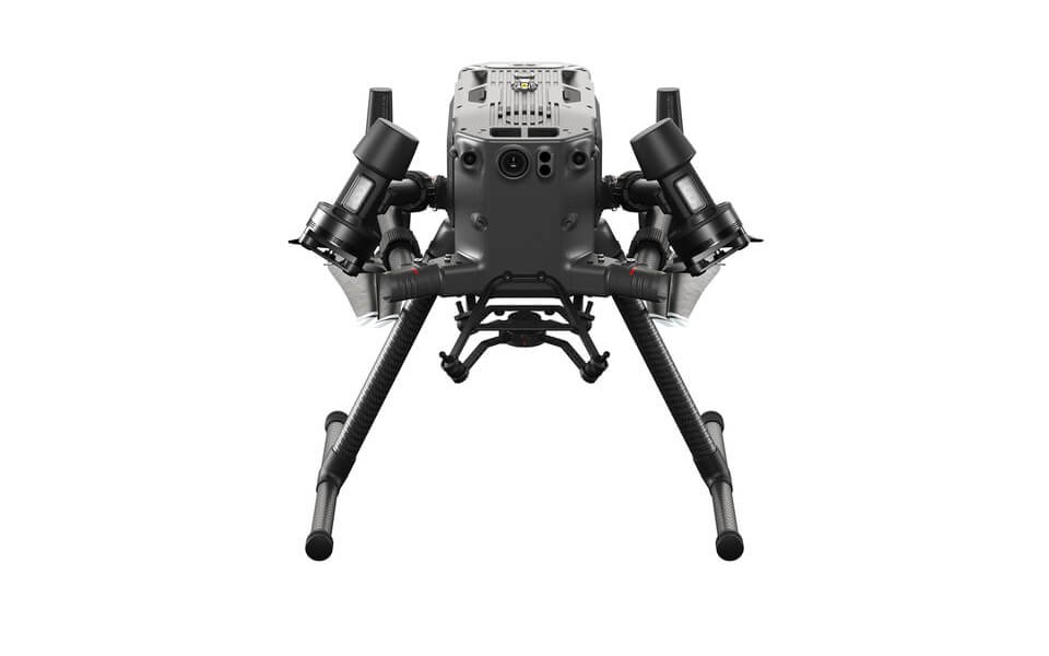 Une fois le DJI Matrice 300 RTK sorti de sa valise de transport rigide et déplié ses bras, vous remarquerez que les moteurs sont en dessous des bras. Le corps du Matrice 300 RTK, et donc son centre de gravité, se trouve au dessus des hélices. Cela permet une plus grande agilité, une accélération et une maniabilité accrues même par vent fort ou en conditions difficiles. Le châssis se trouvant au dessus du drone, les capteurs d'obstacles à 6 directions ont donc une vue dégagée de toute hélice ou autre accessoire. Enfin, pour l'homologation du Matrice 300 RTK, l'installation d'un parachute d'urgence sera plus simple et n’interférera pas avec les accessoires une fois le parachute déployé.